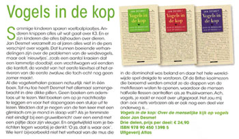 ‘Drie prachtboeken’ ‘Dit boek is zo heel veel meer dan een mooie collectie krantenkoppen, vaardig aan elkaar gepraat. In Vogels in de kop tekent zich een echte biografie af van de rijke, gecompliceerde en ook moeizame verhouding tussen mens en vogel. Jan Desmet heeft een immense hoeveelheid materiaal geordend tot een zeer helder, goed gestructureerd en leesbaar geheel. Schitterend gedaan!’