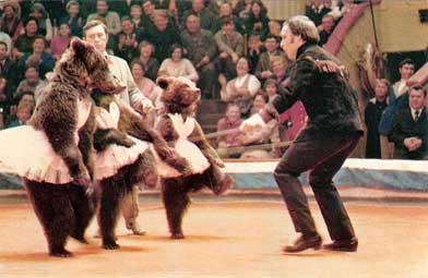 Bij beren waagden de preparateurs zich ook aan vermenselijkte poses, mede doordat een opgerichte beer op mensen lijkt. Ze zullen hun inspiratie deels bij circussen en straatartiesten hebben gezocht, waar beren zijn gedresseerd/‘levend opgezet’ om in tutu ballet te dansen (zie afbeelding onder links), met brommers en fietsen te rijden (illustratie onder rechts), op ballen te lopen, te (rol)schaatsen of uit bierflessen te drinken (krantenkop: ‘Clowns en beren veroveren kinderharten’, 1998). Dierenspektakel waar eind vorige eeuw verzet tegen rees, zoals te volgen