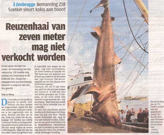 De Z-18 vaarde kennelijk een paar knopen harder dan voorzien want diezelfde avond rond 20.00 uur lag ‘de haai’ reeds op de kade naast de visveiling. De opgetrommelde perslui namen akte van het viswonder dat was geschied en een paar uur later zat de dode reuzenhaai in het laatavondjournaal van de VRT. Volgens de nieuwslezer leefde zo’n haai gewoonlijk honderd meter onder de zeespiegel en was hij gevangen door - pech voor hem - ‘loodrecht naar boven te zwemmen om er plankton te vangen’. Kennelijk hadden de VRT-journalisten de haai nog gauw een diepte-interview kunnen afnemen… De Zeebrugse visafslag gloeit van ambitie (‘Zeebrugse Visveiling wil binnen Europese top tien’, De Standaard 20 februari 2007) maar het geplande haaienfeestje werd ze in extremis door de neus geboord. Het alarm bereikte tijdig de bevoegde viscontroleurs van Landbouw en die belden de visdirecteur met de boodschap dat de reuzenhaai wegens beschermd niet mocht worden geveild. Reuzepech! En reuzegodvers. Het was een lelijke streep door de rekening én het prestige van dit dappere vissersvolk, dus fleemden ze bij de overheidsambtenaar om toch maar hun eer én haaienveiling te redden. Het compromis: een ‘verkoop voor het goede doel’. Een wetsovertreding onder de mantel der liefdadigheid! Wie het boek ‘Beet! Over het leegroven van de wereldzeeën’ van G. Bruce Knecht heeft gelezen (zie deze site, rubriek Recensies) weet dat hij van broodvissers de gekste smoezen en duisterste praktijken mag verwachten. Uiteindelijk ging hun doorzichtige vlieger niet op en werd de reuzenhaai, zoals de Europese regelgeving voorschrijft, officieel in beslag genomen (hij mocht zelfs niet eens worden aangeland, waardoor de zaak allicht een juridische staart krijgt). De dag erna, woensdag 8 augustus 2007 - de vissers glorieerden en bloc als ouderwetse trofeejagers op de cover van Het Volk (‘Reuzenhaai in de netten’, zie afbeelding) -, maakten de media wereldkundig dat er naast vogelbescherming ook zoiets als visbescherming bestond (‘Reuzenhaai van zeven meter mag niet verkocht worden’, Het Nieuwsblad). De